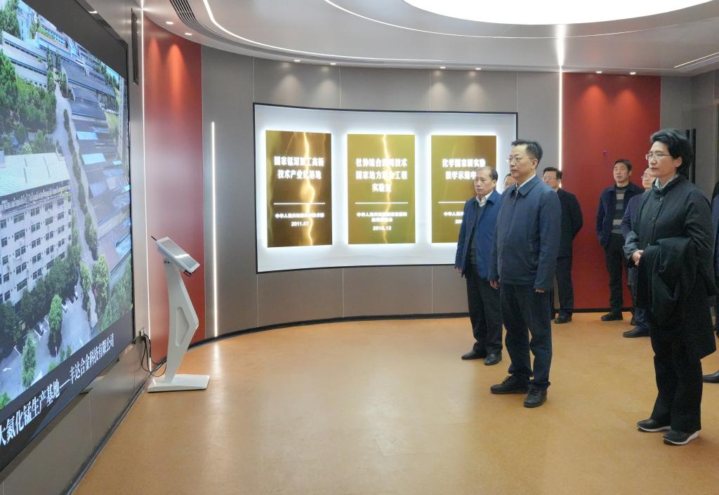 图为夏智伦一行参观我校化学化工学院科研成果陈列室